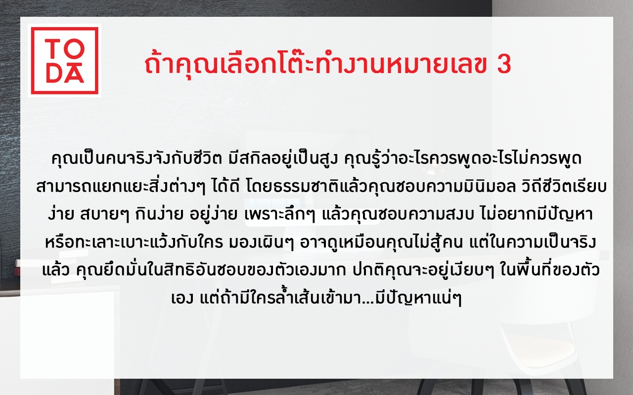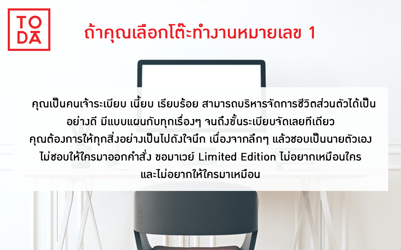 เป็นอย่างไรกันบ้างค่ะ โต๊ะทำงานที่คุณเลือกตรงตามนิสัยของคุณรึปล่าว...