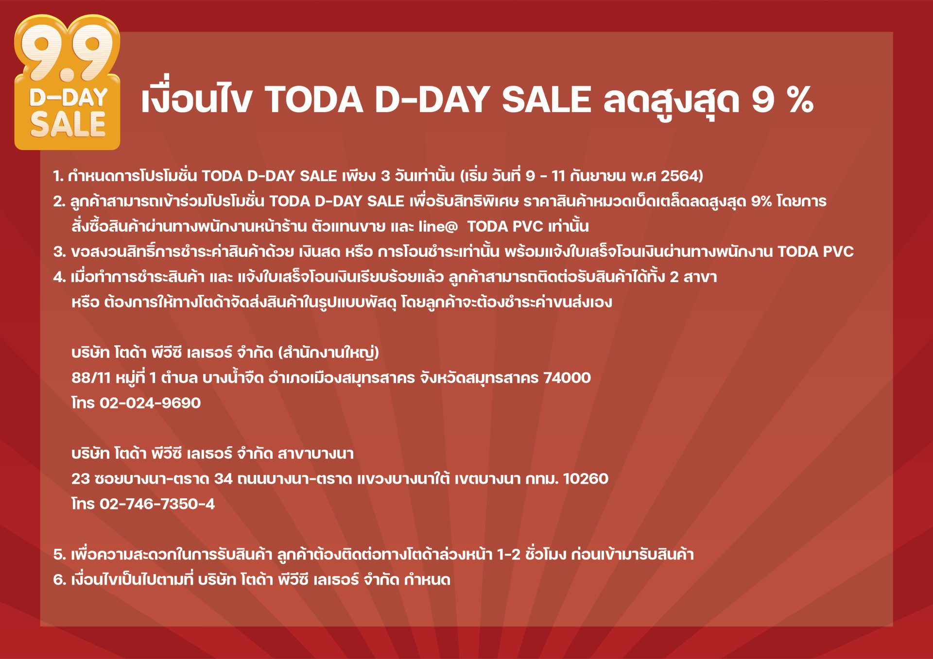 2. ลูกค้าสามารถเข้าร่วมโปรโมชั่น TODA 9.9 D-DAY SALE เพื่อรับสิทธิพิเศษ ราคาหน้าร้านลดสูงสุด 9%