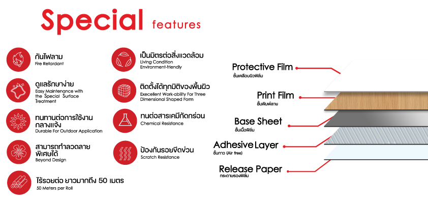 Interior Film TODA สามารถติดตั้งได้บนพื้นผิวเรียบเกือบทุกประเภท อาทิเช่น ไม้เอ็มดีเอฟ ไม้อัด เหล็ก กระจก อะลูมิเนียม วีว่า ยิปซัม สมาร์ทบอร์ด WPC และแผ่นพลาสวู้ด หรือแม้กระทั่งผนังงานคอนโดในปัจจุบัน อย่างเช่น ผนังพรีแคส รวมถึงงานเฟอร์นิเจอร์เดิมที่ปิดผิวด้วยแผ่นลามิเนต ก็สามารถฟิล์มทับผิวเดิมได้ทันที มีขนาดความยาว 50 เมตร ช่วยให้สามารถติดตั้งบนพื้นที่ที่ยาวโดยไม่มีรอยต่อ หน้ากว้าง 1.22 เมตร เท่ากับไม้อัด MDF HMR หรือแผ่นผนังเบา ความหนา 0.35 มิลลิเมตร ใช้ไดร์เป่าลมร้อนเพื่อยืดให้ง่ายต่อการติดตั้ง เทคโนโลยีกาวตาราง (Air Free) ช่วยไล่ฟองอากาศ ติดตั้งรวดเร็ว ลดขั้นตอนในการเก็บมุม สามารถหุ้มแทนการปิดทีละด้านได้เลย กันน้ำ ไม่เป็นเชื้อรา สามารถเช็ดทำความสะอาดด้วยน้ำเปล่าและผ้าสะอาดชุบน้ำเช็ดทำความสะอาดทั่วไป ไม่ต้องเก็บสีรอยต่อ ป้องกันปัญหาสีไม่ตรง ไม่มีฝุ่นและกลิ่นเหม็น ติดตั้งเสร็จสามารถเข้าใช้งานได้ทันที ไม่มีเสียงขณะติดตั้ง ใช้เครื่องมือ คือคัตเตอร์ และที่รีดเท่านั้น
